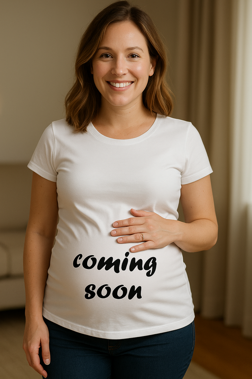 La maglietta premaman bianca con la chiara scritta nera “coming soon” regala sorrisi, like e sguardi curiosi. Dalla prima foto segreta al grande annuncio: una maglietta, mille momenti “awww”.