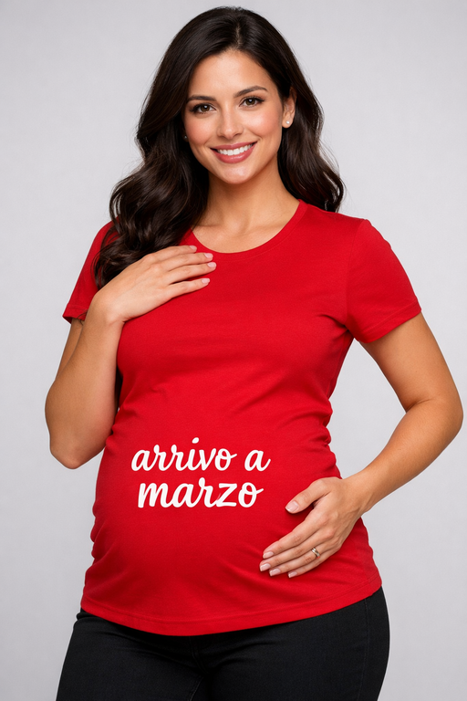 Quando il pancione diventa il protagonista, questa maglietta premaman rossa con stampa bianca arrivo a marzo parla per te: comoda, d’effetto e pronta a scatenare sorrisi e domande dolcissime.